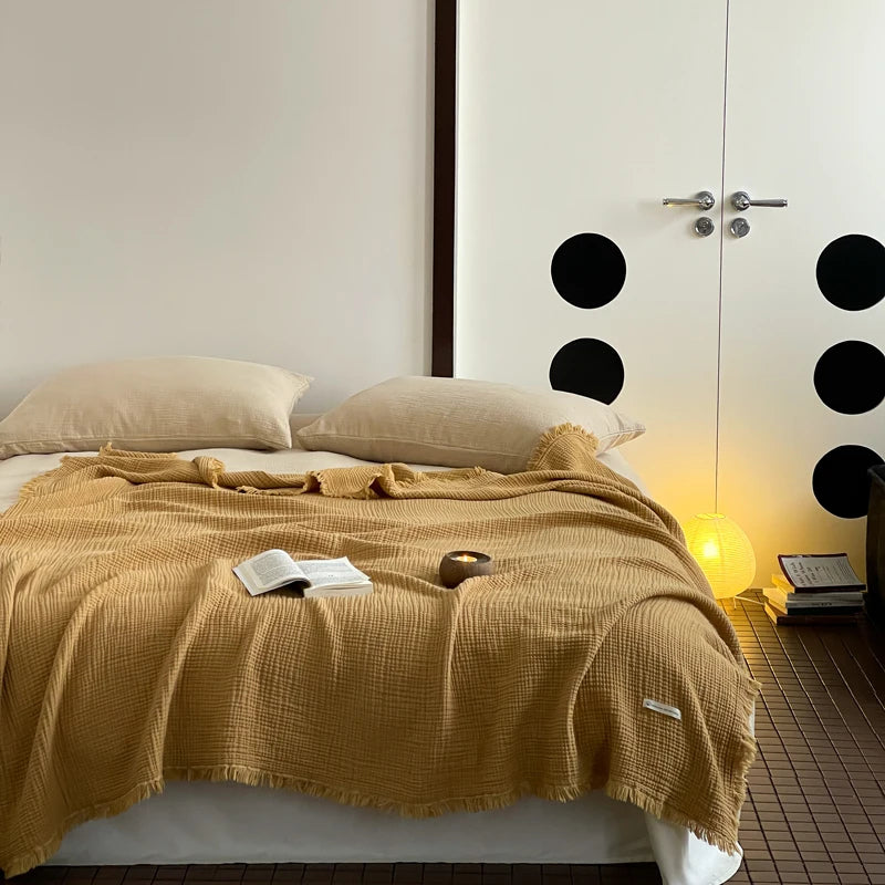 This cotton throw blanket is your go-to for warm nights. Textured, tassel-trimmed, and easy to layer.